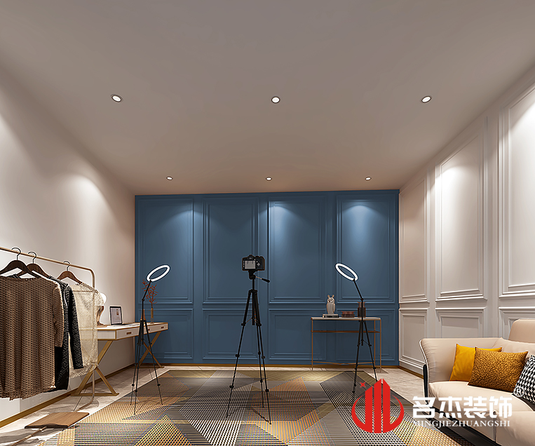 在直播間和展廳區域使用不同的造型增加整體的設計感,天花造型也不會過于浮夸,部分墻體使用時下流行的霧霾藍來作為點綴色,使得整體的時尚感更加特出。