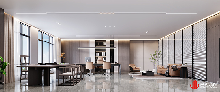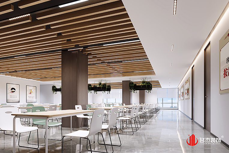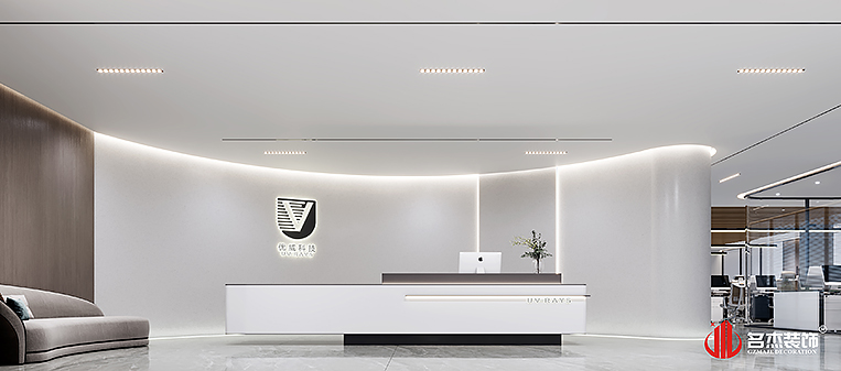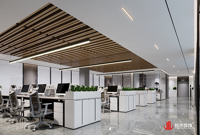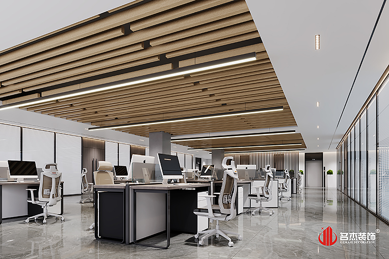 一樓大堂區域使用的是時尚風格搭配奢華的元素,讓整體空間看上去更加大氣時尚。在兩邊設置的企業文化墻以及大屏幕,可以讓來訪的客戶迅速了解到企業的發展歷程以及企業文化。而在開放辦公區域則使用鋁格柵天花作為空間的點綴元素,簡約元素搭配出不一樣的層次感。