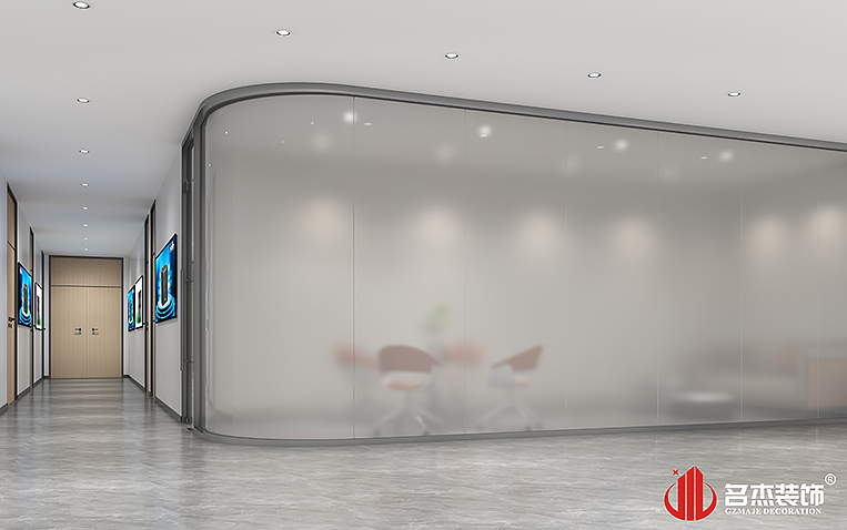 這次辦公裝修設計空間的層高是可以搭建兩層的,因此在前臺區域使用中空的設計手法,搭配時尚簡約的元素,讓前臺空間變得更加有氛圍感。整潔、簡約、大氣,都能夠在這個空間中很好的融合到一起。使用弧形前臺背景墻,寓意著魚如得水。而會議室中使用的是熱彎的霧化玻璃,能夠很好地保證隱私,同時也能夠在空閑的時候,讓整體空間看起來更加通透。