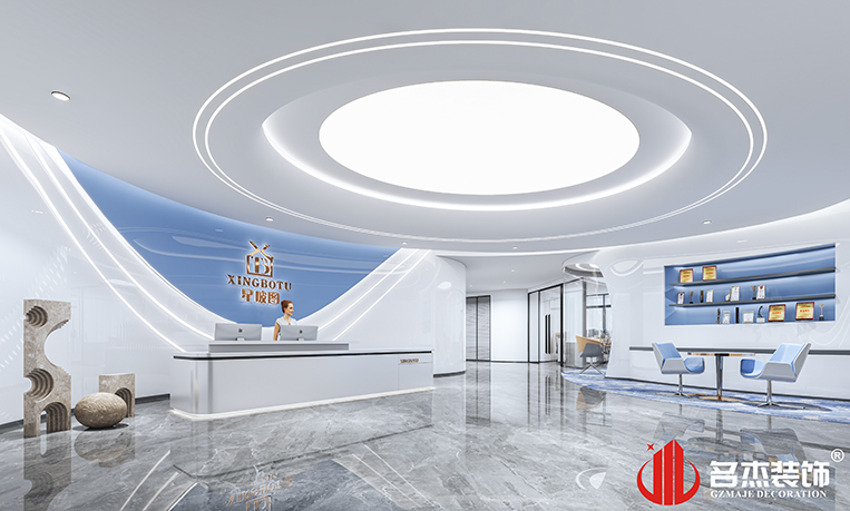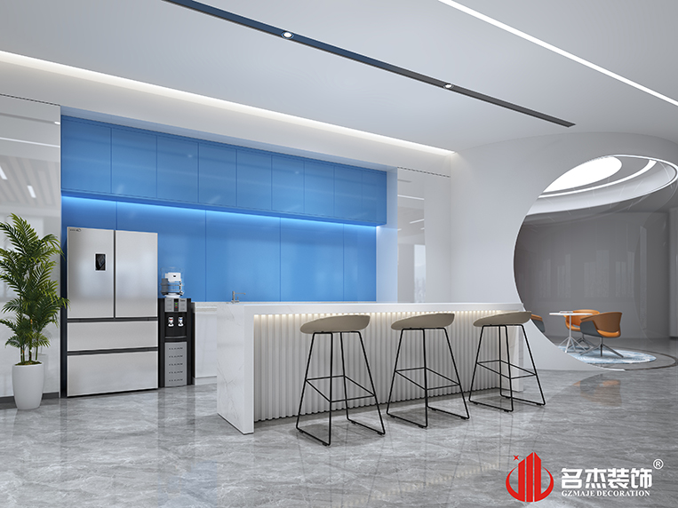 整體使用時尚簡約的風格,讓辦公空間看起來更加簡潔,同時在不同區域使用藍色作為點綴色,給空間增添了幾分科技感的同時,也讓空間變得不那么單調。前臺區域使用圓弧造型的吊頂,搭配弧線形的背景墻,形成一種呼應的同時,還能夠增加前臺空間的層次感。在辦公區域使用藍色噴漆,區別于傳統的黑白灰,讓空間更加具有辨識度。